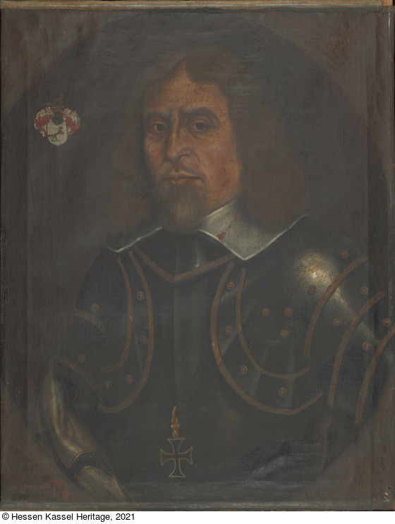 Aufkleber: Unbekannter Maler, Johann Fuchs. (geb. 6.7.1574 im Hochstift Münster, gest. 7.8.1631 in Marburg) 1615 Eintritt i. d. DO. 1627 Landkomtur min Marburg. |