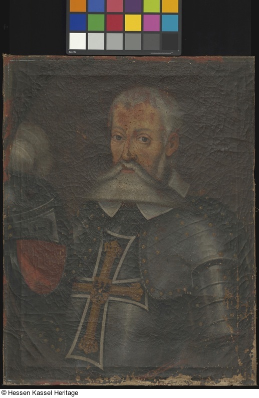 Aufkleber: Unbekannter Maler, Wolfgang Schutzbart gen. Milchling. (geb. um 1483 in Treis an der Lumda gest. 11.2.1566 in Mergentheim) [...]7 Eintritt i. d. DO. [...]-40 Landkomtur in Marburg, [...]43 Administrator des Hochmeistertums in Preußen und Meister des Deuts |