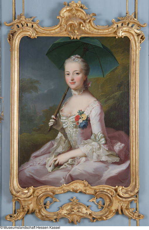 Eva von Buttlar (1723 - 1785), Gemahlin des Philipp von Egge. Blassviolette Taille mit grün-weißen Bändern am Ausschnitt u. an den Ärmeln, lange Handschuhe, deren linker auf dem Schoß gehalten wird, während die rechte Hand im Handschuh mit freigelegtem Zeigefinger einen grünen Sonnenschirm hält. Sträußchen von Georginen in Rot u.Gelb, Weiß u. Blau an der linken Brust. Doppelte Spitzenärmel. Halsrüsche in Spitzen, weiß-rote Blüten im Haar. Munterer Ausdruck der grauen Augen. Die Halsrüsche oder das herabhängende gepuderte Haar ist von einem rosa ins Weißliche u. Lila spielenden Band gehalten, das der Gewandfarbe entspricht. Landschaftsausblick mit Baumformen.