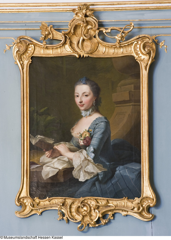 Marie Sophie Tischbein, geb. Robert (gest.1759), erste Gemahlin Tischbeins (nach Bleibaum irrtürmlich zweite Gemahlin Tischbeins). In hellblauem Kleid mit dunklerem u. hellerem am Rock senkrecht, an den Ärmeln waagrecht laufendem Streifen. Halsband auf Spitzengrundlage mit blau-weißer Bandrüsche. Dasselbe Band auch am Ärmel. Dreifache Spitzenmanschetten u. Spitzen am Ausschnitt. Sträußchen aus einer roten, einer rotweißen Nelke u. einer dritten dicht gefüllten Blüte gelb mit roten Flecken. Helles gedämpftes Blau. Die linke Hand über das rechte Handgelenk gelegt, die rechte Hand hält eine Broschüre, die in Buntpapier geheftet ist. Der Steintisch scheint sich nach hinten in ein Vasenpostament fortzusetzen, das teilweise vom rechten Rand überschnitten wird. Hintergrund Spalier. (Im gepuderten Haar blaue Blüten). Grosse braune Augen, der Gesichtsschnitt gerade, aber zart bewegt.