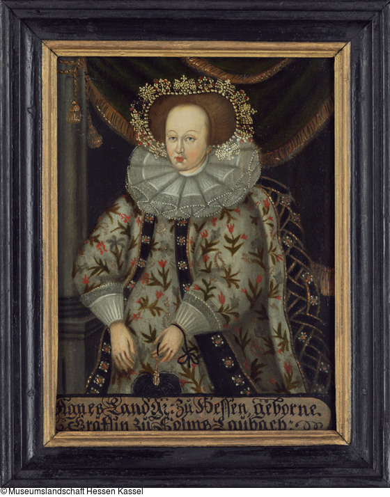 Kniestück der Landgräfin Agnes im Dreiviertelprofil nach links. Im Hintergrund rechts ein grüner, zurückgeschlagener Vorhang mit goldenen Fransen. Links dagegen eine Säule, deren andere Hälfte im Gegenstück der Portraitierten, nämlich mit Landgraf Moritz dem Gelehrten wieder auftaucht. Die Landgräfin trägt ein überreiches, hochgeschlossenes hellgraues (wohl weißes) Kleid mit aufgestickten Tulpen. Der beinahe zu den Schultern reichende Mühlsteinkragen, sowie die Manschetten von feinster Spitze gebildet. Über dem Kleid ein Umhang von gleichem Material, dessen Borten mit Rosetten von großen roten Edelsteinen und Perlen besetzt sind. Es folgt über die Schultern gelegt ein Mantel, gefüttert im gleichen Stoff, auf der Außenseite dagegen von verwobenen, schwarzen Borten gebildet, die an den Säumen von goldenen Posamenten gefaßt und mit Rosetten von Perlen und Edelsteinen besetzt sind. Die Haare über der hohen, weißen Stirn hochgeflochten oder toupiert und von einem großen, sehr kostbaren Perlen-Edelstein-Diadem umgeben. In den vor ihrem schwangeren(?) Leib herunterhängenden Händen ein Beutel(?) an einer Schnur. (Auch hier hat der Kopist wiederum das Attribut von der zweizeiligen Inschriftenkartusche geschnitten. Diese lautet: ''Agnes Landgr: Zu Hessen, geborne. | Gräffin zu Solms-Laubach:''
