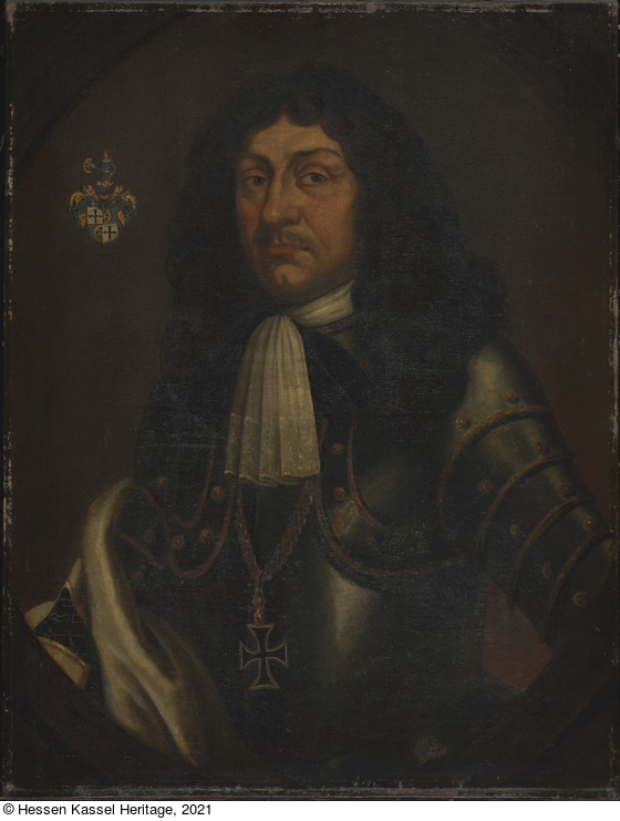 Aufkleber: Gen. Katal. No. 11089; Aufkleber: Schloss Wilhelmshöhe Lfd. Nr. 687.; Aufkleber: 687; 687; Aufkleber: Unbekannter Maler, Johann Daniel von Priort (gb. 19.2.1618, gest. 26.9.1684 in Marburg) 1639 Eintritt in die Ballei Sachsen, 1678 Statthalter u. Landkomtur i. Marburg |