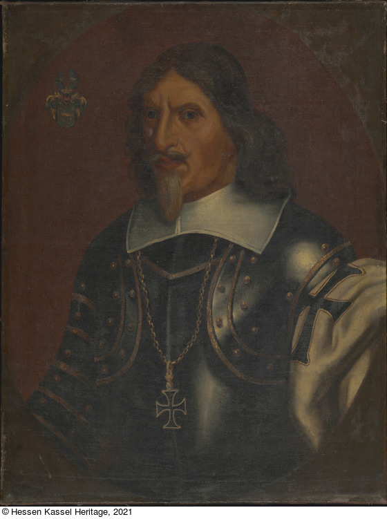 Aufkleber: Eigentum Univ. Museum Marburg L.; Stempel: Museum der Universität Marburg/L. (Aufkleber); Aufkleber: Löwenburg; Aufkleber: Gen. Katal. No. 11296; Aufkleber: Unbekannter Maler, Georg Daniel von Habel. (geb. 25.12.1592 in Lützelrig bei Fritzlar, gest. 29.5.1652 in Marburg) 1609 Eintritt i.d. DO. 1639 Landkomtur in Marburg. |