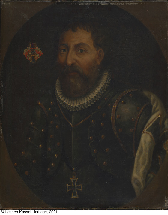 Aufkleber: unbekannter Maler, Johann von Rehen (geb. um 1490, wohl in Waldeck, gest. 2.12.1570 in Marburg) 1514 Eintritt i. d. D.O. 1543 Landkomtur in Marburg.; Aufkleber: Löwenburg |