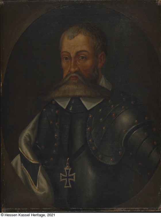 Aufkleber: Eigentum Univ. Museum Marburg L.; Stempel: Museum der Universität Marburg/L. (Aufkleber); Aufkleber: Schloss Wilhelmshöhee Lfd. Nr. 675; Aufkleber: Gen. Katal. No. 11077; Aufkleber: 675; Signatur: Unbekannter Maler, Wolfgang Schutzbar gen. Milchling. (geb. um 1483 in Treis an der Lumda, gest. 11.2.1566 in Mergentheim) 1507 Eintritt i.d. DO. 1530-1540 Landkomtur 1543 Administrator des Hochmeistertums in Preußen und Meister des Deutschen Ordens. |