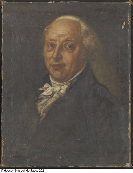 Vor dunklem Hintergrund ist als Brustbild im 3/4 -Porträt ein älterer Herr, den Betrachter anblickend, zu sehen. Er ist in einen dunklen Rock gekleidet, um den Hals trägt er ein geknotetes Halstuch. Seine Haare sind natürlich und weiß. Leider ist nicht bekannt, um wen es sich handelt, auch gibt es keine Attribute, die auf Beruf oder Tätigkeitsbereich hinweisen.