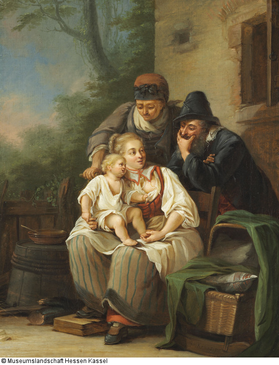 Die Szene entspricht in ihrer gefälligen und sentimentalen Weise den aufgeklärten bürgerlichen Idealen von Familie und Mütterlichkeit. Sie erinnert an die zahlreichen kleinformatigen Genreszenen mit typisch bürgerlichen Bildthemen, die Kraus in Anlehnung an Jean-Baptiste Greuze (1725-1805) und die Niederländertradition während seines Parisaufenthaltes von 1761 bis 1766 gemalt und gezeichnet hat. Den Einfluß von Greuze, aber auch von Boucher und Watteau stellte Johann Wolfgang von Goethe mit Blick auf die Gemälde seines Freundes besonders heraus und schloss: »Alles dergleichen konnte unser Kraus in sein Talent sehr wohl aufnehmen; er bildete sich an der Gesellschaft zur Gesellschaft und wußte gar zierlich häusliche freundschaftliche Vereine porträtmäßig darzustellen [...]« (Goethe 1981, S. 172).