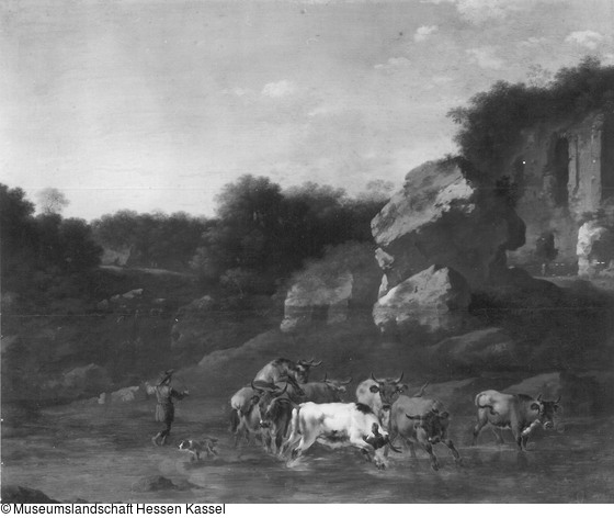 In den bisherigen Galeriekatalogen als Werk des C. van Poelenburch mit Staffage von C.P. Berchem. Hofstede de Groot schrieb zu Recht das ganze Bild Berchem zu. Dieselbe Rindergruppe findet sich in Berchems 1656 datiertem Gemälde »Viehherde in einer Furt« im Rijksmuseum Amsterdam, Inv. Nr. A 30. GK 196 entstand ungefähr gleichzeitig.