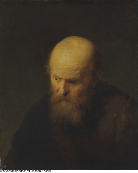 Von Rembrandt sind eine ganze Reihe von Darstellungen – Zeichnungen, Radierungen, Gemälde – bekannt, in denen er das Motiv des alten bärtigen Mannes, der seinen Kopf vornüberbeugt, behandelt hat. Eine 1630 datierte Radierung zeigt ihn beispielhaft, ähnlich entwickelte Rembrandt ihn auf Historienbildern 1629/1630 im kleinen Figurenmaßstab. Bis zu einem bestimmten Grad folgt auch noch das sehr kleine Gemälde Alter Mann mit Pelzmütze in Innsbruck von 1630 diesem Typus. Die Verfasser des Rembrandt-Corpus nahmen 1982 die malerischen Qualitäten solcher authentischer Gemälde zum Ausgangspunkt ihrer Überlegungen, was von einer Darstellung Rembrandts eines Greisen im größeren Maßstab zu erwarten sei. In einer sehr differenzierten Analyse kommen sie zu dem Schluss, daß die Malerei des Kasseler Kahlköpfigen alten Mannes zwar deutlich an Rembrandts Arbeitsweise erinnert, daß aber auf der anderen Seite Schwächen unübersehbar sind: Der opak gestrichene Hintergrund vermittelt keine Tiefe, das verschattete Auge schafft einen zu dunklen Akzent, das Gewand besitzt keine Plastizität wie ebensowenig die verschattete Gesichtshälfte und andere Beobachtungen mehr. So kommen sie letztlich zu dem Schluss, daß die ausführende Hand des Gemäldes nicht Rembrandt selbst gewesen sein kann. Eine Beziehung des Gemäldes zu dessen gesichertem Werk scheint den Verfassern aber dennoch gegeben zu sein, so daß sie einen verlorenen Prototyp Rembrandts annehmen. Ein Reflex könne in einer Radierung mit dem Datum 1631 gefunden sein, die früher Rembrandt zugeschrieben worden ist, heute aber als Werk von Jan van Vliet gilt. Der dargestellte Greis zeigt ein insgesamt mehr verschattetes Gesicht, er hat den Mund leicht geöffnet, ansonsten aber entspricht er dem Typus des Kasseler Gemäldes und gibt sogar statt dessen summarisch behandelter Gewandung eine verständliche Form an. Dies zeigt ähnlich eine gemalte Kopie, ehemals in der Sammlung Schmetz, Aachen, wie auch eine Mezzotinto-Wiedergabe Preislers von 1755.